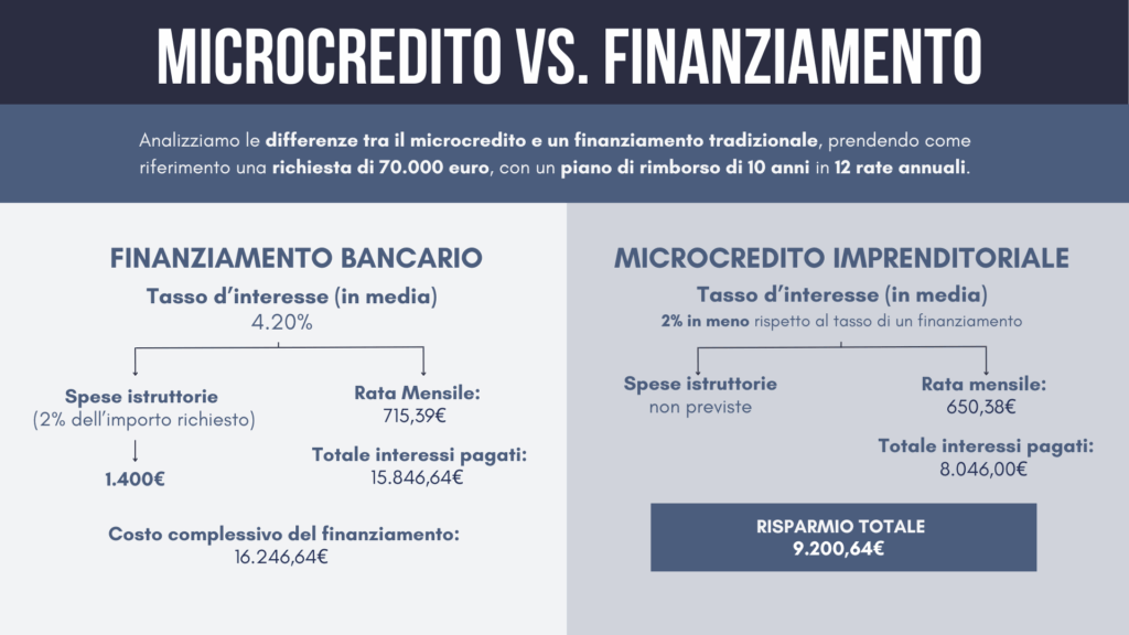 Per esempio, richiedendo 70.000 euro con un piano di rimborso di 10 anni, il microcredito permette di risparmiare oltre 9.000 euro rispetto ad un finanziamento bancario tradizionale, grazie a un tasso d’interesse mediamente più basso e all’assenza di spese accessorie all’erogazione.